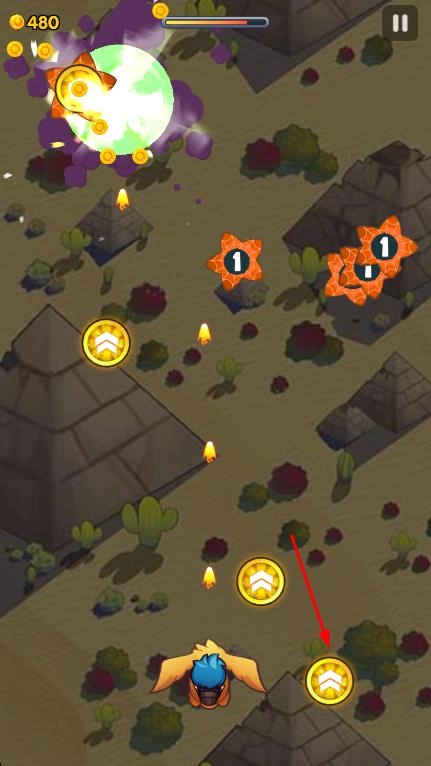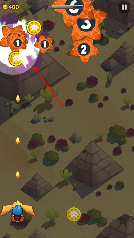 把角色移动到【金币】的周边,持续攻击剩下的【橙色-星形-带数字】物体,以快速获得更多金币。