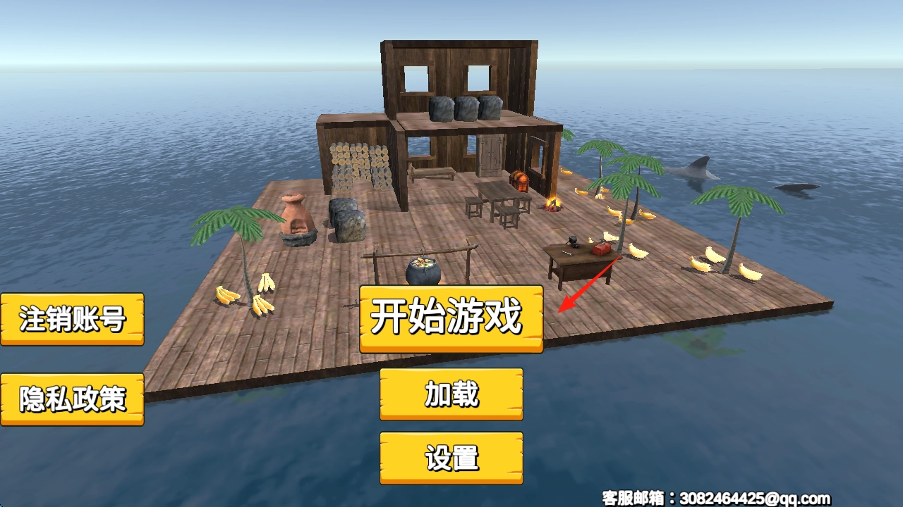 点击界面上的【开始游戏】按钮(就是那个红箭头指向的地方),就能进入海岛场景啦。接下来你要操控角色,用左边的摇杆控制移动,同时熟悉一下游戏界面,比如背包和工具这些功能,然后就可以开启你的生存之旅了。