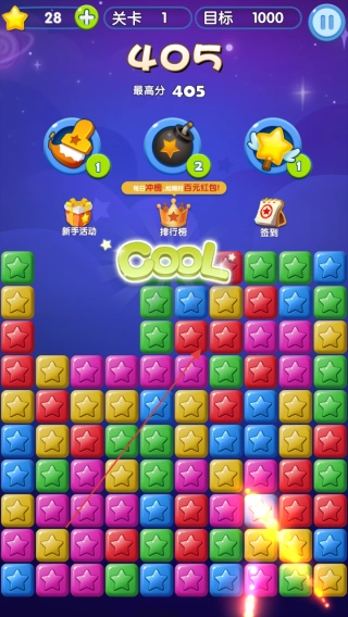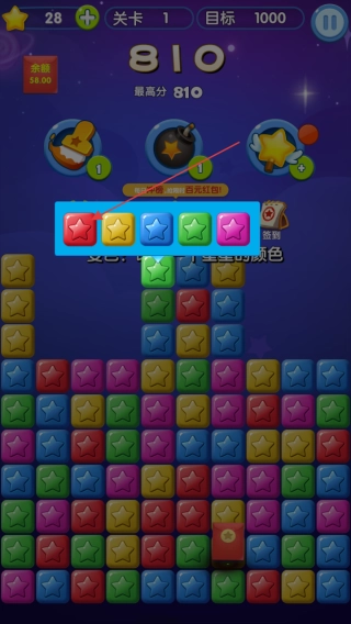 进入第一关后,留意彩色星星的分布情况,点击相邻的相同颜色星星进行消除,通过积累分数来挑战目标。