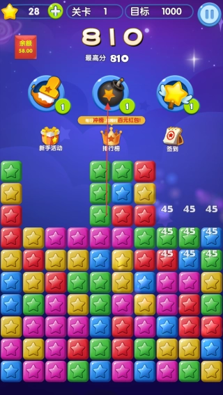 可以多留意界面上的功能设计,比如那些能改变颜色的道具,点击它们就能调整星星的色彩,这样就能创造出更多相同颜色星星消除的机会,进而让得分得到提升。