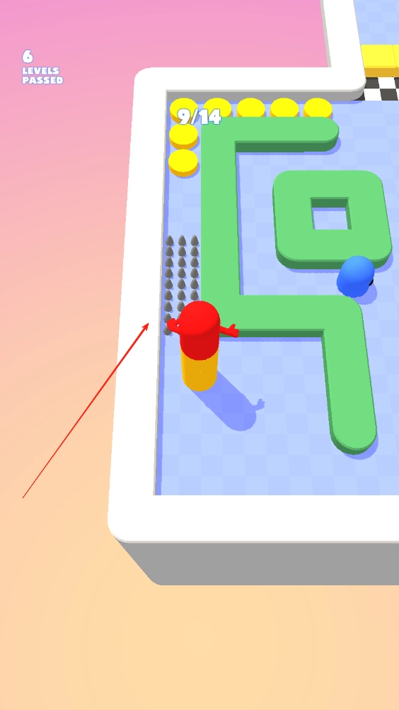 在收集目标数量金币的过程中,需要留意避开蓝色小人的巡逻以及地面上的尖刺,这些障碍都可能造成金币数量的减少。