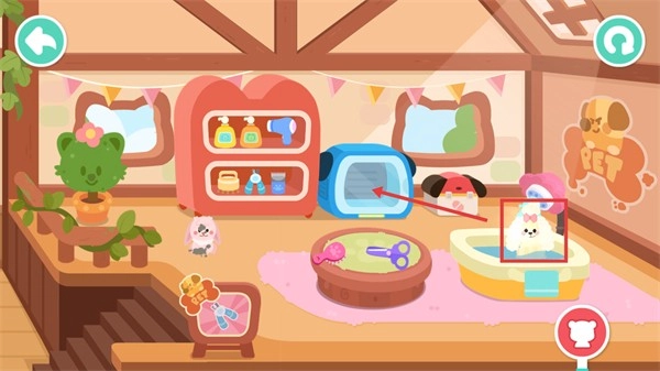 2、选中待护理的宠物,将其移动至洗护区域,准备开展清洁、美容等护理操作,推进宠物互动流程。