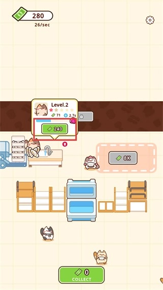 3、消耗对应钞票可以给猫咪进行升级来提升其工作效率,后续可等待【COLLECT】按钮积累收益。