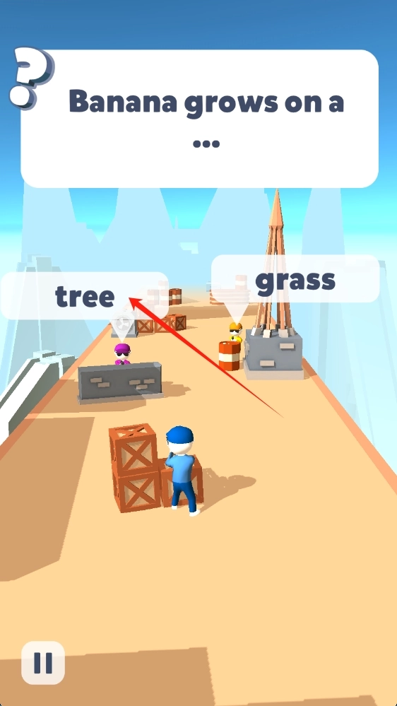 在游戏里,当遇到像“Banana-grows-on-a”这类问题时,需要依据已有的知识选出正确答案(比如“tree”),然后通过射击的方式来作答。