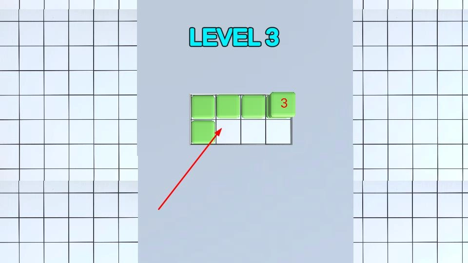 进入LEVEL 3关卡后,网格区域里有绿色方块和标着数字3的方块,你需要拖动绿色方块往右边的空格移动,按照数字的提示来扩大填充的范围,完成这一层的方块布局。