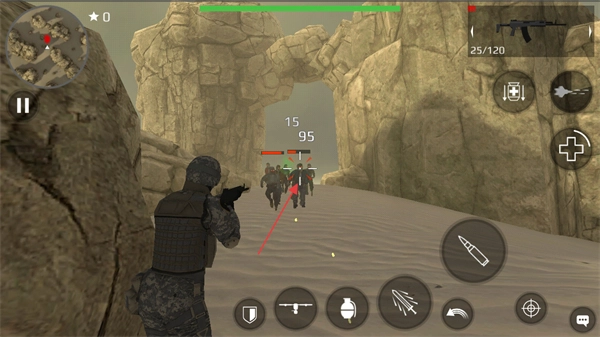 观察左上角的地图来掌握敌人的位置,操控角色在沙漠地形里移动,同时留意寻找可以隐蔽的掩体。