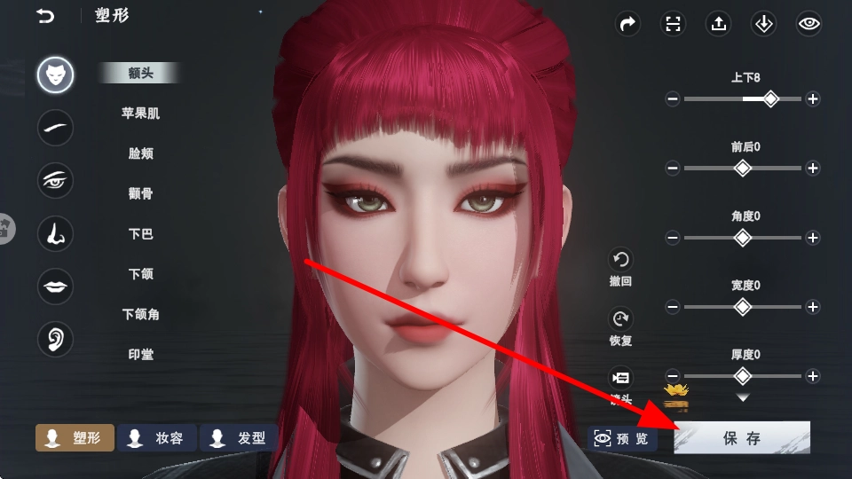 在进行角色塑形时,可对额头、苹果肌等面部参数进行调整,以此打造出符合自己心意的角色形象。待调整完成后,点击保存按钮,即可确定最终的角色外观。