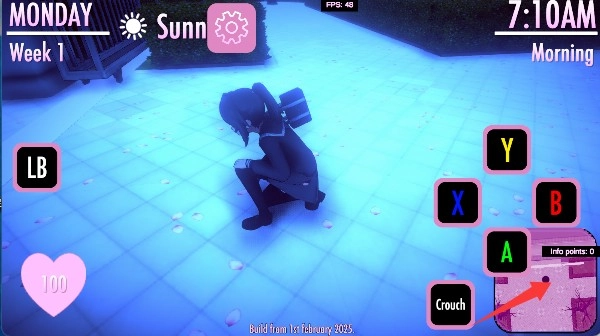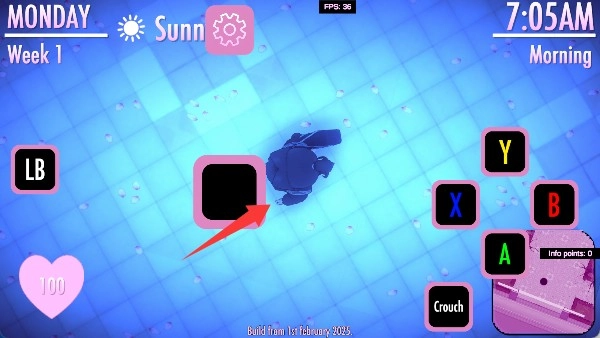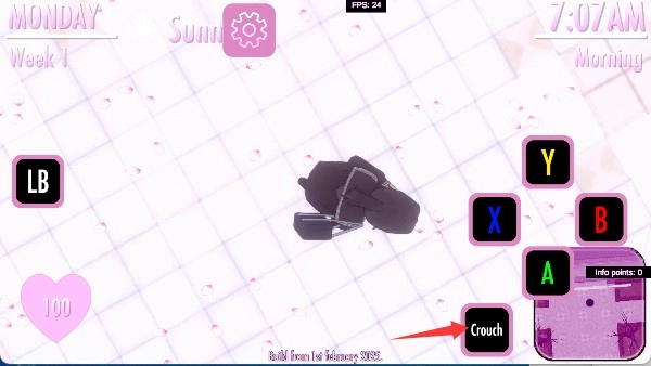 2、点击红色箭头标识工具可以让游戏人物蹲下