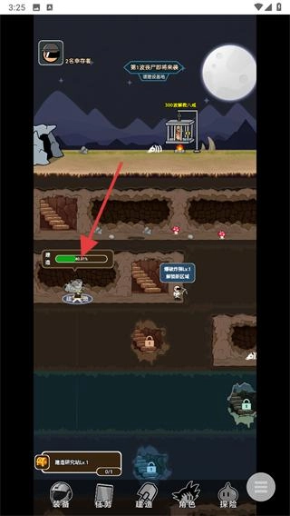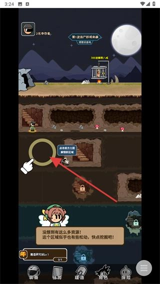 游戏开局我们得搭建起专属的绝地基地,按照游戏的指引点击下方的土层来开展挖掘工作。