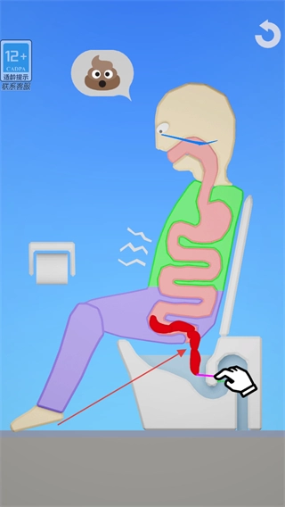 按照提示对相应物品进行操作,拖动物品使其拉出肠道并掉入马桶内,以此满足角色的相关需求。
