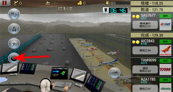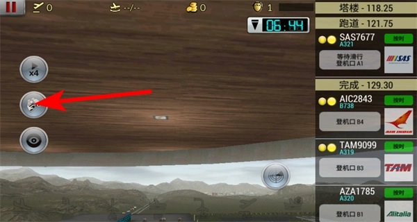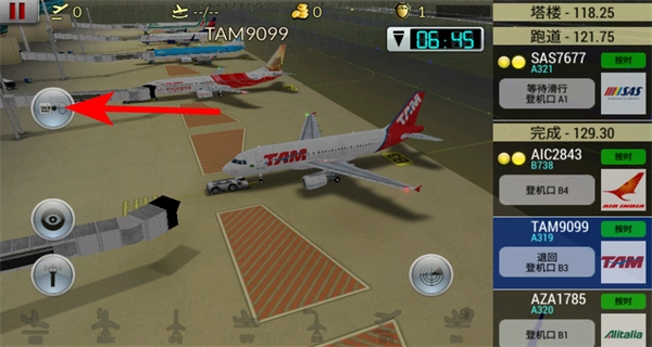 进入游戏后,点击左侧如示意图中标识的对应按钮,即可开启机场调度的操作流程。