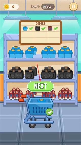 按照指引依次点击货架上对应的蓝色上衣、黑色包、红色鞋子,即可完成订单物品的选取操作。