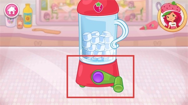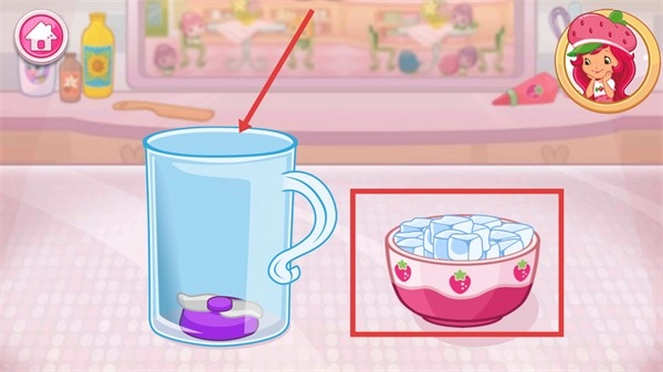 2、制作第一步,将右侧【草莓碗装冰块】添加到杯子中,完成基础材料的准备。