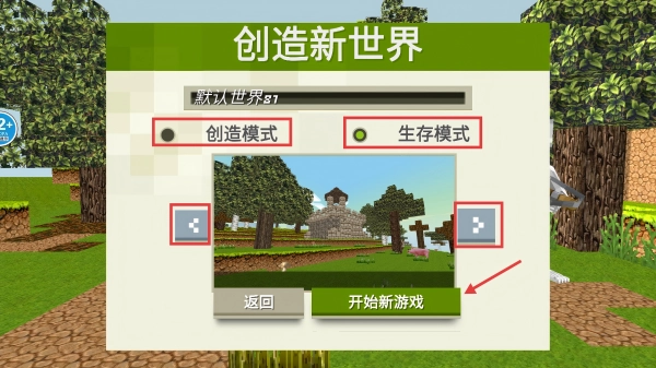 进入创建新世界的界面后,先选定创造模式或生存模式,对预览场景进行调整,再点击【开始新游戏】按钮,就能开启全新的游戏世界了。