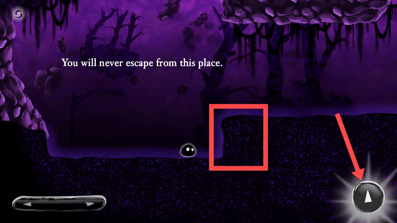 当碰到红框里的地形障碍时,点击右下方的【三角】按钮,操控黑色小球角色跳跃穿过。