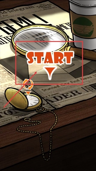 1、点击【START】启动游戏,界面的放大镜、怀表是场景元素,按提示操作进入关卡,开启该解谜类游戏的流程。