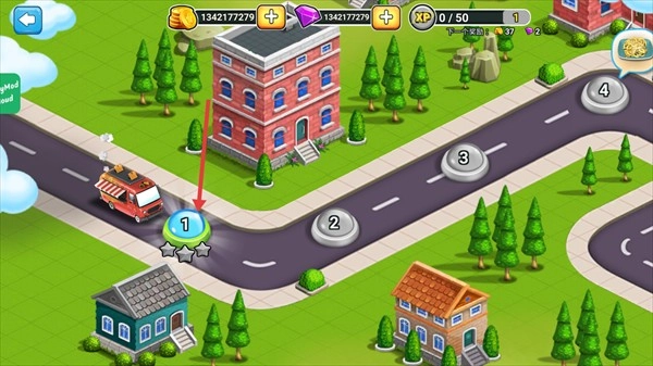 2、点击红色箭头指向的【1】关卡按钮,开始第一关游戏。