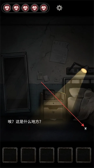 进入这个光线昏暗的房间场景后,点击下方对话框上的箭头图标,就能推动当前场景的剧情往下发展,与此同时还要注意房间里那些可以互动的物品。