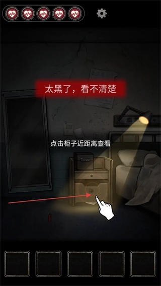 当在这个场景里看到“太黑了,看不清楚”的提示时,就跟着指引点击房间里的柜子,进入柜子的近距离查看界面,这样就能去探索柜子相关的解谜线索了。