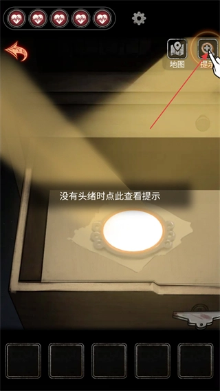 在解谜探索时要是没了思路,可以点击界面右上角的提示按钮,来获取当前场景的解谜指引,另外也能通过地图按钮查看场景的布局情况。