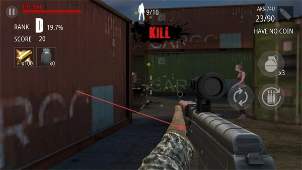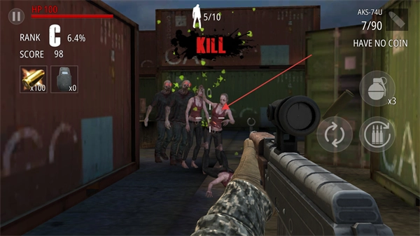 用枪械对准僵尸进行射击,消灭它们来积累击杀数量和游戏分数。