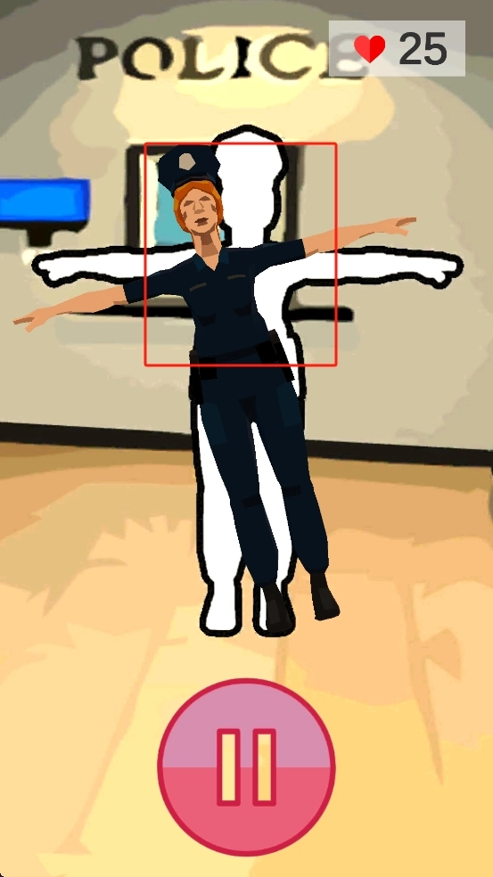 进入作品后,我们先观察警察在警局内的动作轮廓,接着快速模仿他张开双臂的姿势,使身体与白色剪影重合,以此完成动作挑战。