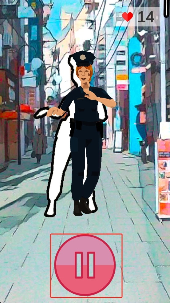 进入街道场景后,要密切关注警察即时摆出的手势和肢体动作,迅速进行同步模仿,确保自己的姿态与白色剪影保持一致,避免爱心值下降过多。