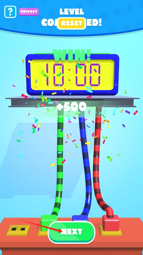 成功解开缠绕后,在胜利界面点击NEXT,进入下一关,继续挑战更高难度的缠绕谜题,赢取更多奖励。