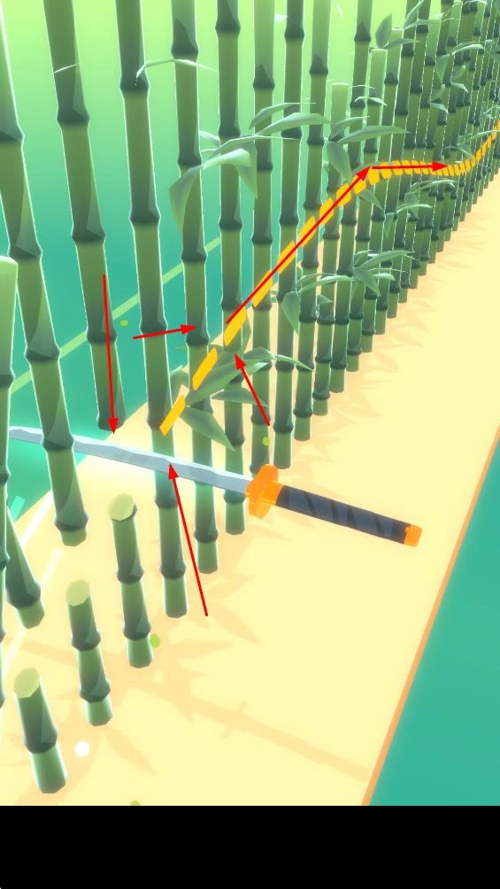 在路径行进过程中,碰到竹子之类的不同物体时,调整刀剑的方向进行精准切割,不断向前推进,以此积累关卡进度。