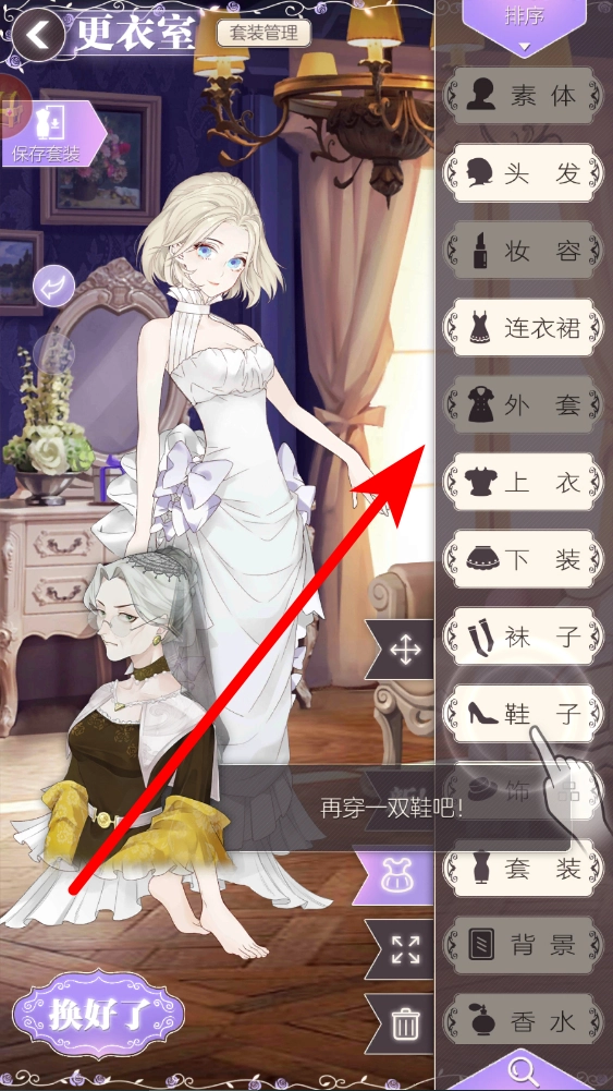 在更衣室里可以给角色进行装扮,能选择素体、头发、妆容、连衣裙等多种服饰和装扮类别,挑选自己喜欢的样式来为角色搭配,点击“换好了”就能确认装扮。