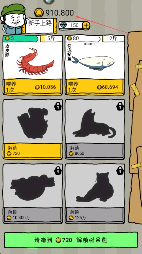 当金币积累到910800时,你可以选择继续喂养已解锁的动物,也可以选择持续积攒金币,为解锁更高级的动物做准备。