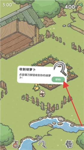 当接到“收割胡萝卜”的任务时,点击镰刀图标,对已经成熟的作物进行收割操作,以此来获取相应的资源,这些资源可用于作物种植的升级以及道具的兑换。