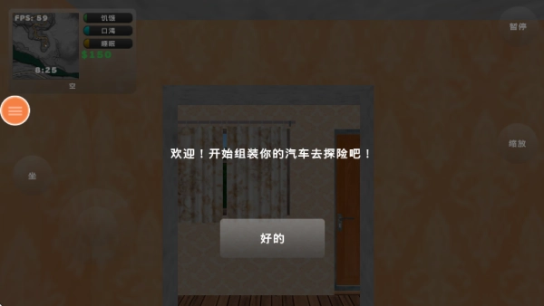 进入游戏后,屏幕上会显示任务目标说明,像图中展示的那样,玩家得收集零件来组装汽车,之后才能开着车去探索这个世界。