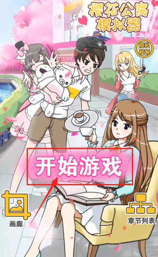 点击粉色的“开始游戏”按钮即可进入游戏,您可以通过左下角的画廊功能查看已收藏的内容,也能在右下角的章节列表中选择初始章节,开启这段游戏旅程。