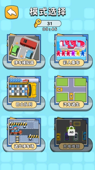 单局的目标是把指定车辆从停车场开出去,通过这一局就能解锁下一个关卡,难度会随着车辆数量的增加和停车场结构的复杂程度而逐步提升。