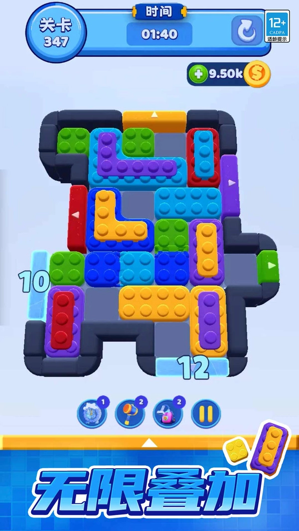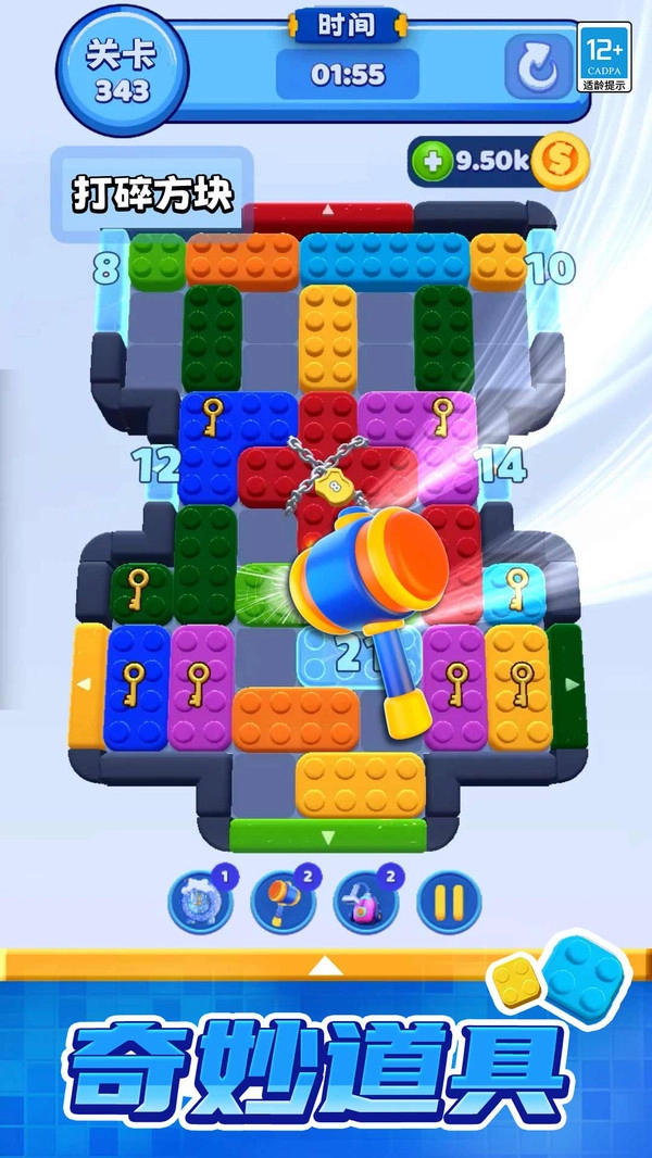 随着游戏难度的增加,方块的数量、颜色、布局都会发生变化,需要玩家仔细规划消除路线。