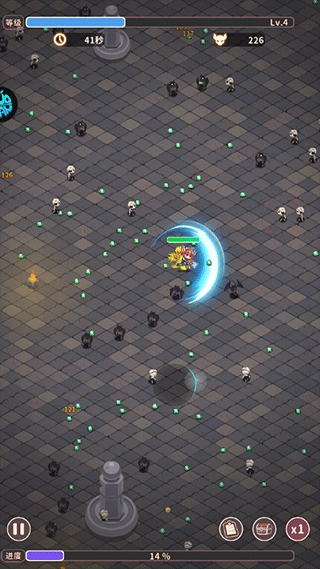 5、界面上方的蓝色条状物是等级进度提示,当经验值积累满后角色就会升级;每次升级都能随机获得一个技能,若重复获取到同一个技能,该技能还能进一步升级强化,其威力也会随之大幅提升。