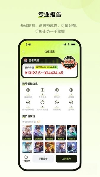 3秒钟即可生成多维度可视化估值报告,其中涵盖账号基础信息、价值维度分析、市场行情对比等内容。