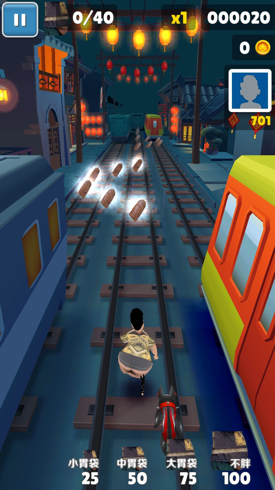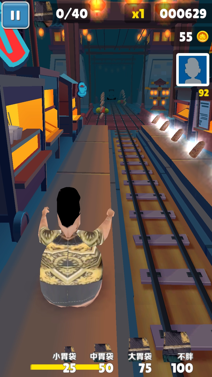 还原地铁跑酷的玩法,躲避场景里的障碍物并收集胃袋