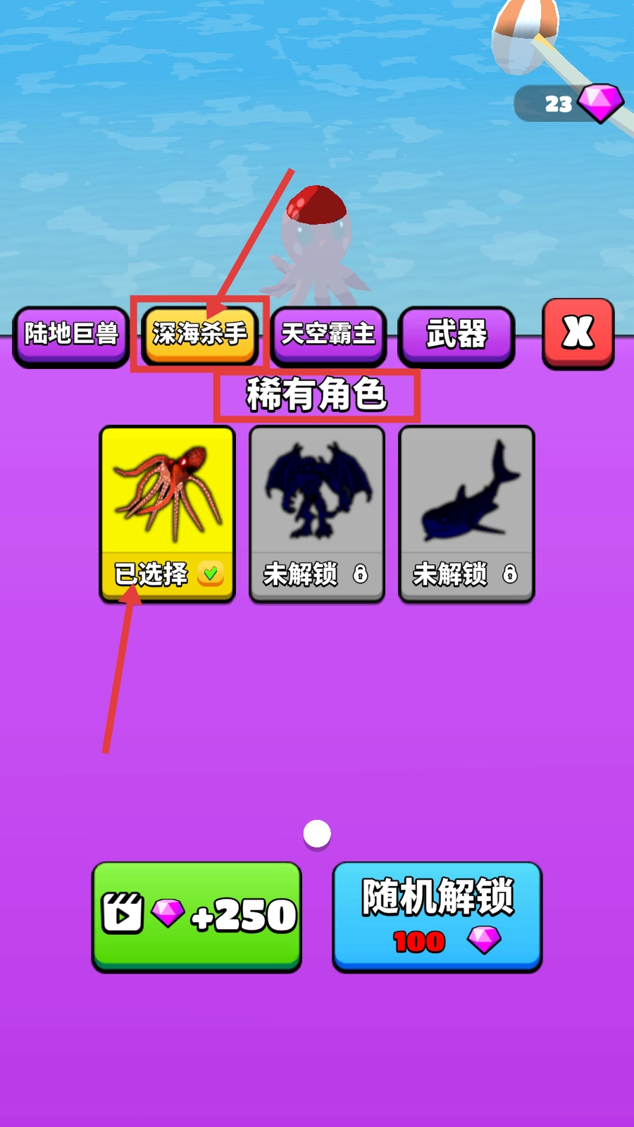 在【深海杀手】分类中已选定稀有角色章鱼,若想拓展阵容,可通过“随机解锁(消耗100钻石)”或观看广告的方式获取更多角色。