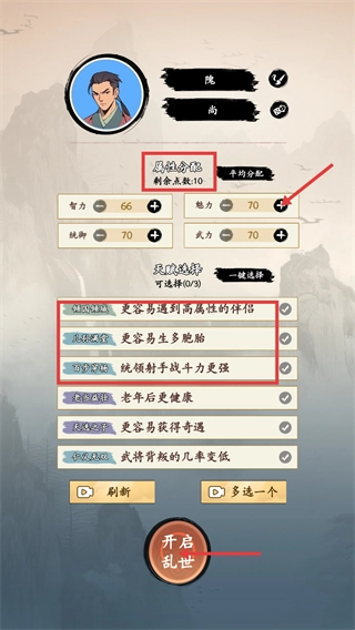 在属性配置界面,利用【剩余点数:10】来调整各项属性,勾选【倾国倾城】【儿孙满堂】等天赋选项后,点击【开启乱世】按钮即可进入游戏。