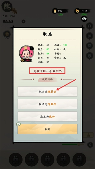 在取名界面,为孩子选择【取名为隗菲音】这类名称选项,完成孩子的命名,以此推进游戏流程。
