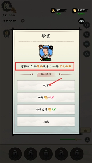 当触发曹操赠送【方天画戟】的珍宝事件时,选择【收下】选项,即可获得这件珍稀宝物,从而提升自身的资源储备。