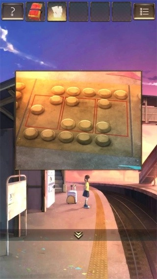 5、向左走到候车厅,找到垃圾箱后查看它,接着对照拼图图案,按顺序点击上面的圆点,打开垃圾箱就能得到【钥匙】。
