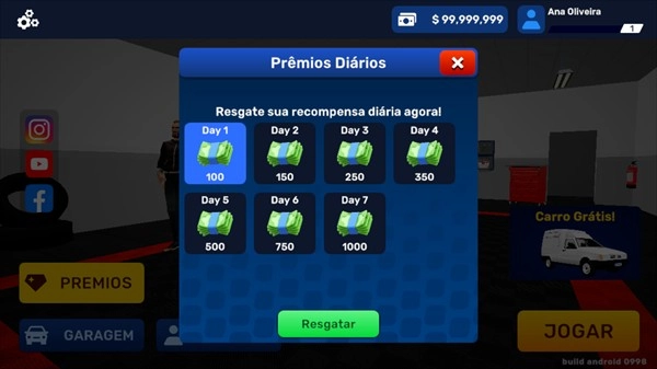 在游戏里,玩家们能在车库中选购各类车辆,选好车辆后点击“jogar”即可开始游戏。游戏的操作方式很简单,左侧按钮负责控制人物移动,右侧按钮则用来控制人物奔跑。