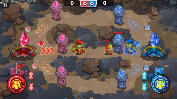 除了僵尸特工,关于另外两种模式基本都是对抗挑战,水晶塔防将展示个人的头脑策略,可选择的三条进攻路径极大的提高了战术的趣味性,而且操作上同样仅需一指便可操作,只不过出兵的方式有点奇特,玩家需要合理控制按压的力度来完成出兵,其中控制在不同的区域可以实现出战的类型也不同。
