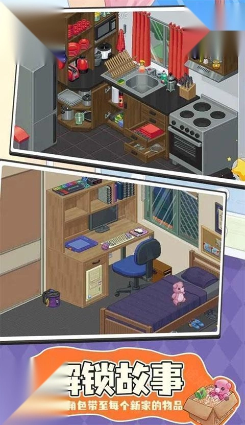 搬家模拟器unpacking游戏结合了方块拼图和家居装饰的玩法,画风简约小清新,弹窗打扰,每一个细节都刻画的非常优质,在游戏中玩家需要将不同的物品放置到房间的各个角落,打造出满足自己风格的小家,整个游戏过程中可以听到轻柔的音效,营造出轻松的氛围,整个的玩法节奏慢、无压力,非常适合在闲暇的时间畅玩。
