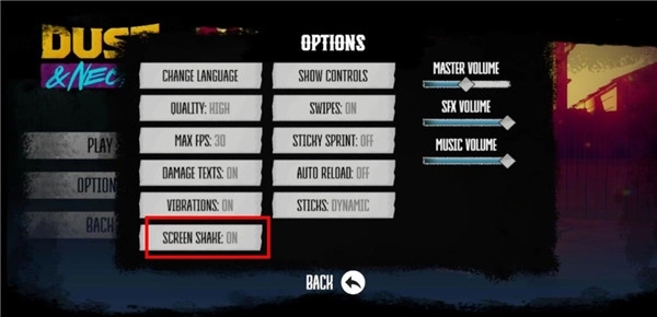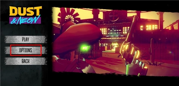 1、安装并启动尘烟霓虹游戏后,会发现它默认显示为英文,所以首先需要进行语言设置,具体操作如下:在游戏主界面找到并点击OPTIONS选项。