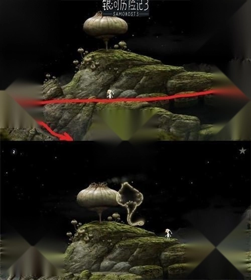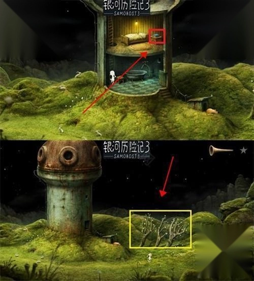 1、点击星球进入。然后映入眼帘的是游戏教程,注意在本作中道具是要拖动使用的。记得先回家拿上红圈床头柜上的蓝色故事书,点击床可以上床睡觉,三楼可以使用望远镜看外太空,一楼有板凳和浴缸。黄圈先点击把所有的花全部点掉,获得一个音乐。点击红色箭头前往左侧场景。