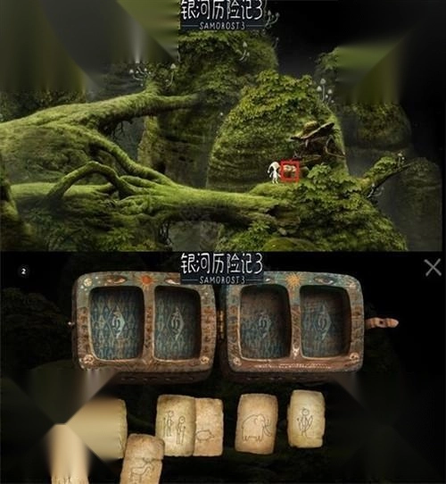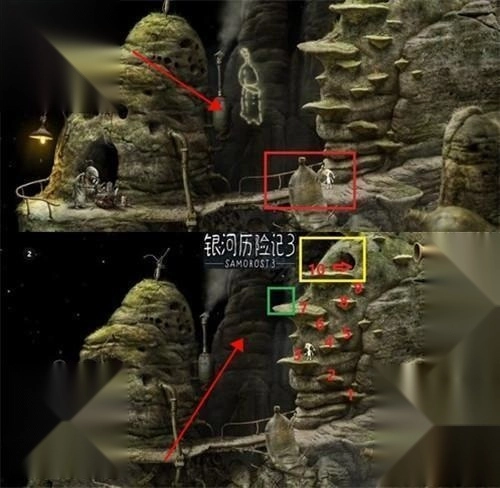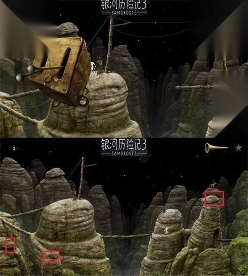 5、前往主角家右侧的场景,先去吊台的控制器进行如图操作,连续进行两次把右边的杆子砸断,通路就可以打通。先别急着过,点击图中三个红圈的石头,多点几次可以得到一个音乐。然后前往下一个场景。
